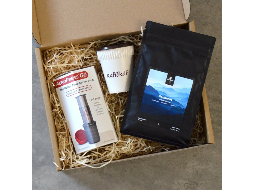 Kávový set s cestovním Aeropressem, hot cupem Kafíčkář a 500 g výběrové kávy pro chvíle na cestách i během dne.