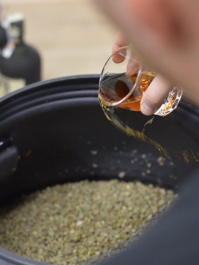 Po lehkém prohřátí v pražícím stroji, aby káva mohla absorbovat co nejvíce rumového aroma, jsem ji zalil kvalitním venezuelským rumem a v uzavřené nádobě bez přístupu kyslíku nechal 24 h odpočívat. Poté jsem ji upražil standardním způsobem na střední stupeň, abych v kávě rozvinul její chuťový potenciál a dal vyniknout rumovým tónům.