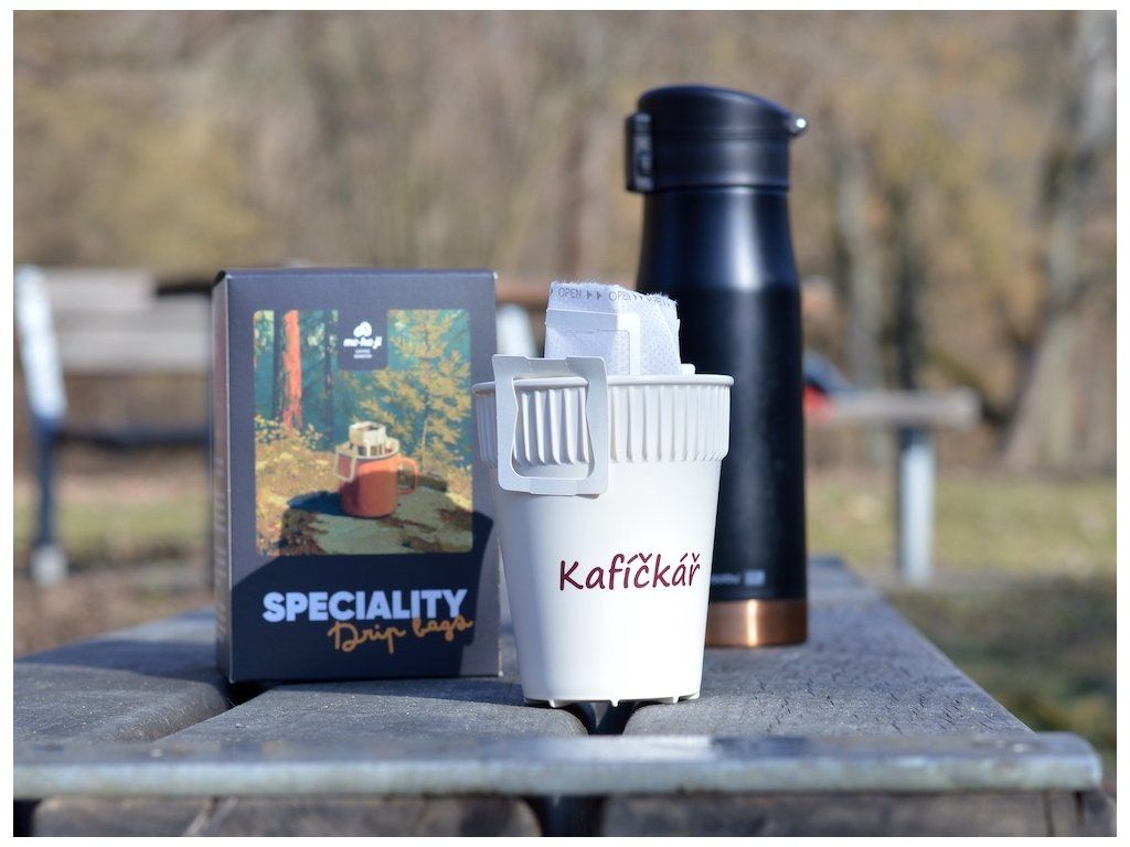 Kávový set s 20 drip bagmi výberovej kávy z Brazílie a Papuy a hot cupom Kafíčkář – ideálny spoločník na cesty aj do práce.
